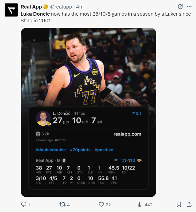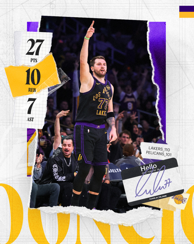 东契奇此役再度创造纪录,在2026年东契奇20次20+5+5联盟第一,单赛季14次拿到25+10+5是湖人队史2001年奥尼尔后首人。